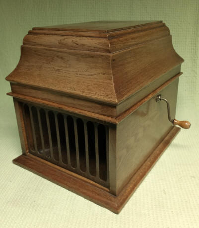 Deze Amberola X heeft een heel mooie eiken kast. Zowel het rooster voor het